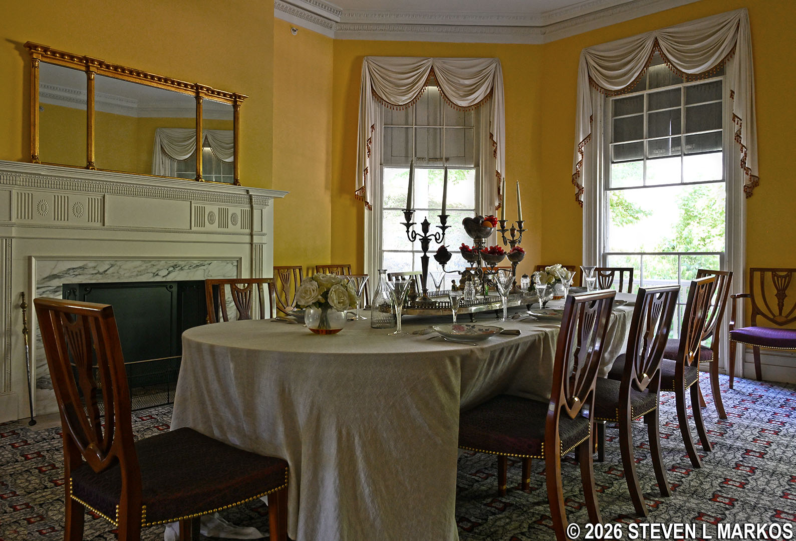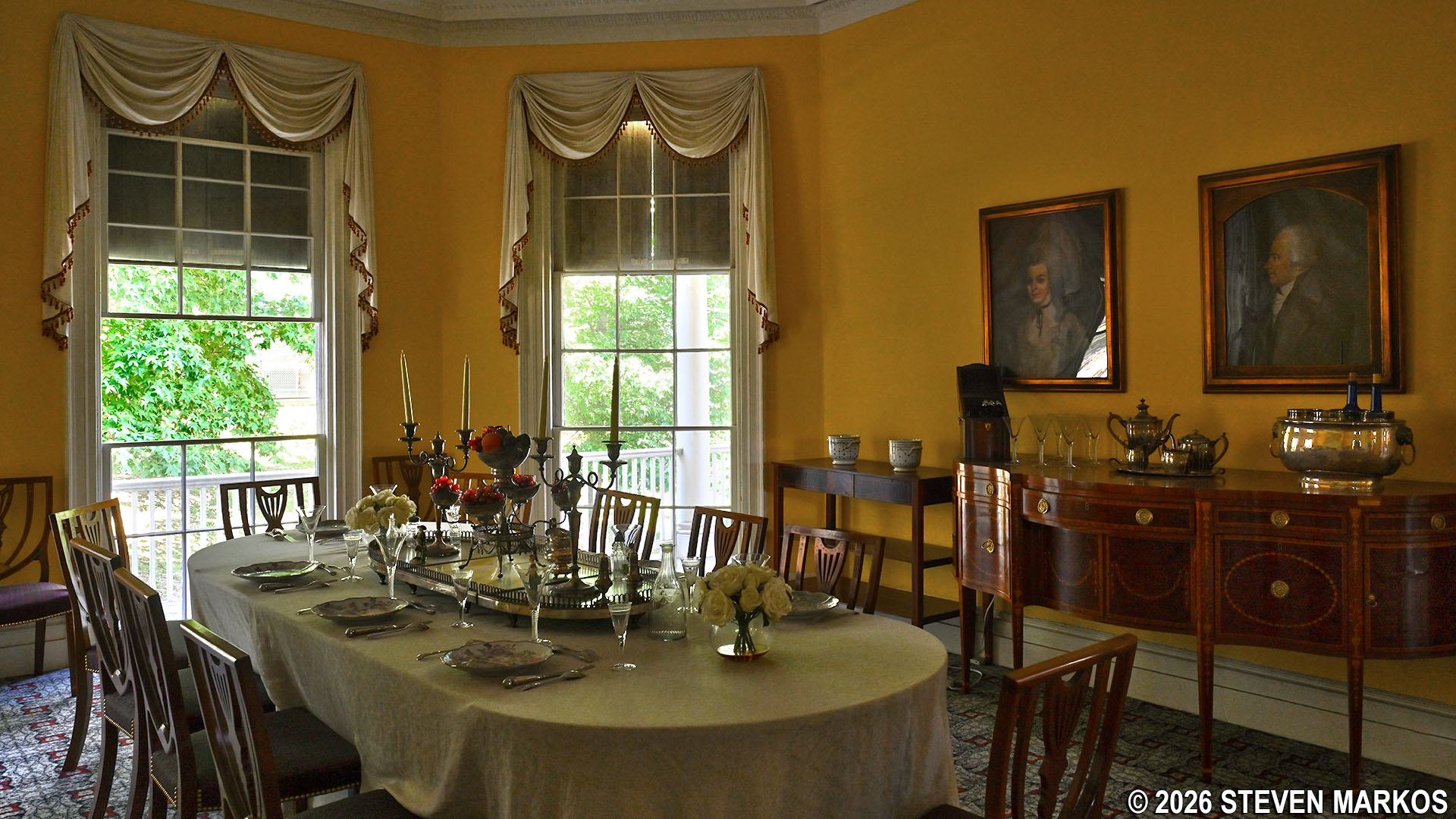 The dining room is furnished per the time period. The only original items are the silver plateau that sits at the center of the table and one of the water pitchers. A wine cooler located on the credenza is a reproduction of a gift that George Washington gave to the Hamiltons.