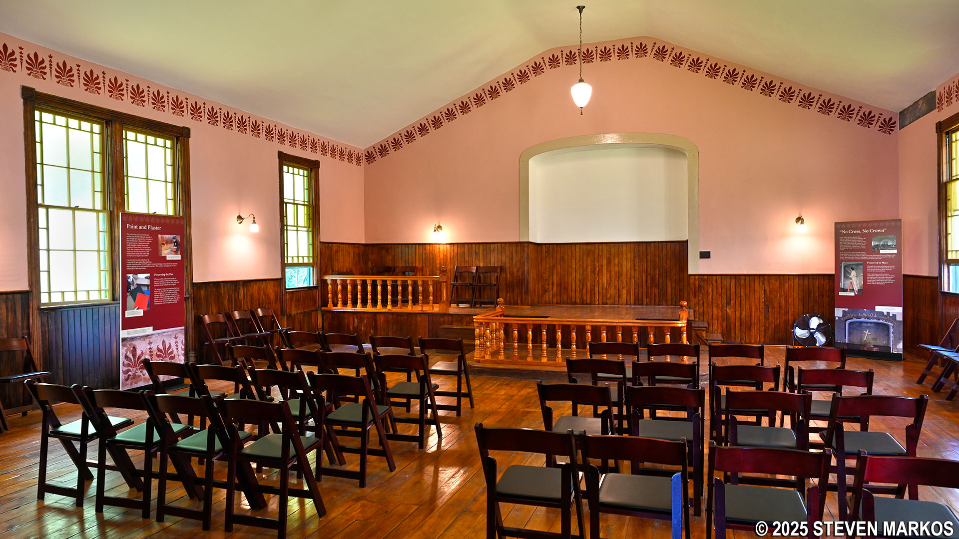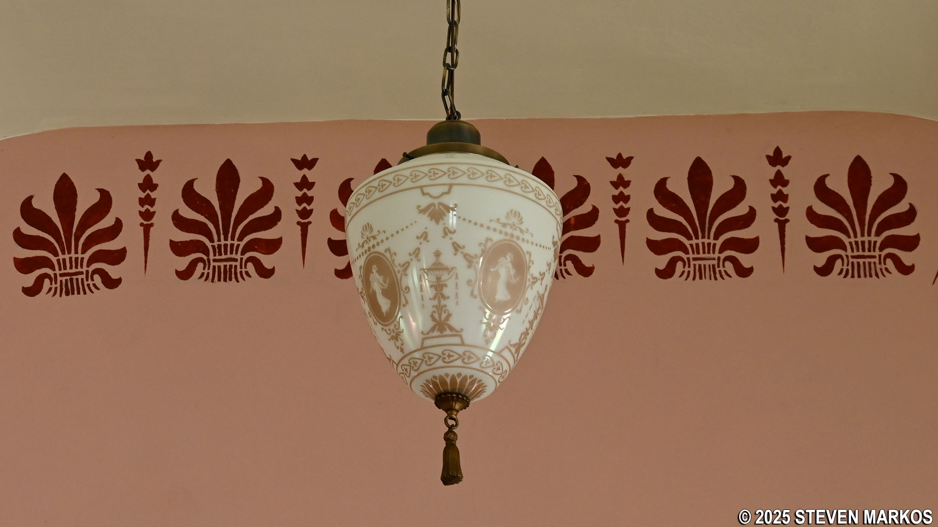 The stenciling along the top of the walls and the globes on the three light fixtures hanging from the ceiling reflect the Greco-style, which was popular at the time. The globes are original to Thompson Memorial and are on loan to the National Park Service from the A.M.E. Zion Church.