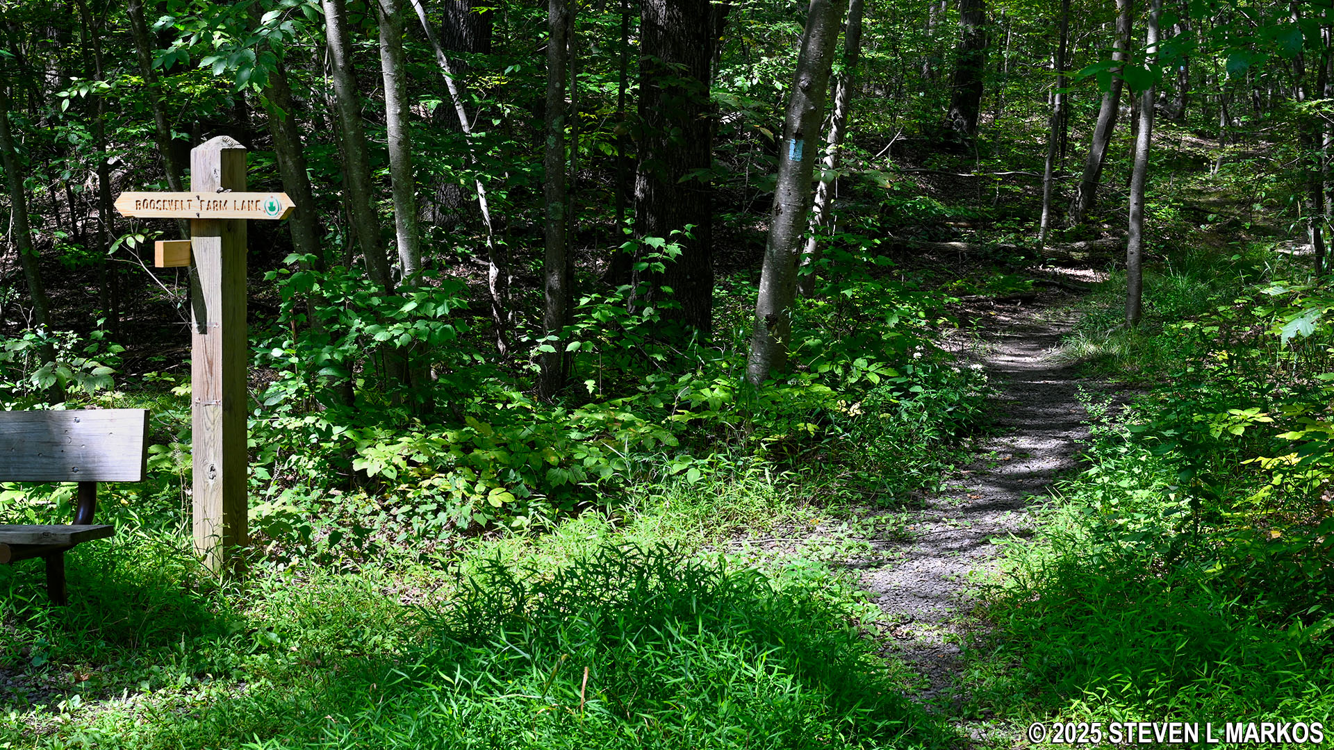The Bennett Trail is one of three traditional hiking trails that branch off from the Roosevelt Farm Lane, a former road that connects Franklin Roosevelt’s Springwood estate at Home of Franklin D. Roosevelt National Historic Site with Eleanor Roosevelt’s Val-Kill cottage at Eleanor Roosevelt National Historic Site. The Farm Lane is 1.8 mile long, one way, so if you hike it and don’t have a ride waiting at one end, you have a 1.8-mile return trip ahead of you. Instead of hiking out and back on the Farm Lane and seeing the same things twice, the side trails provide hikers with a chance to cover new ground during one leg of the journey. They are ultimately all just walks in the woods and do not pass anything interesting or remotely scenic, plus they add about a half mile to the trip, so if your goal is just to get to and from the parks as quickly as possible, stick to the Roosevelt Farm Lane. Also keep in mind that bikes are allowed on the Farm Lane but not on the side trails.