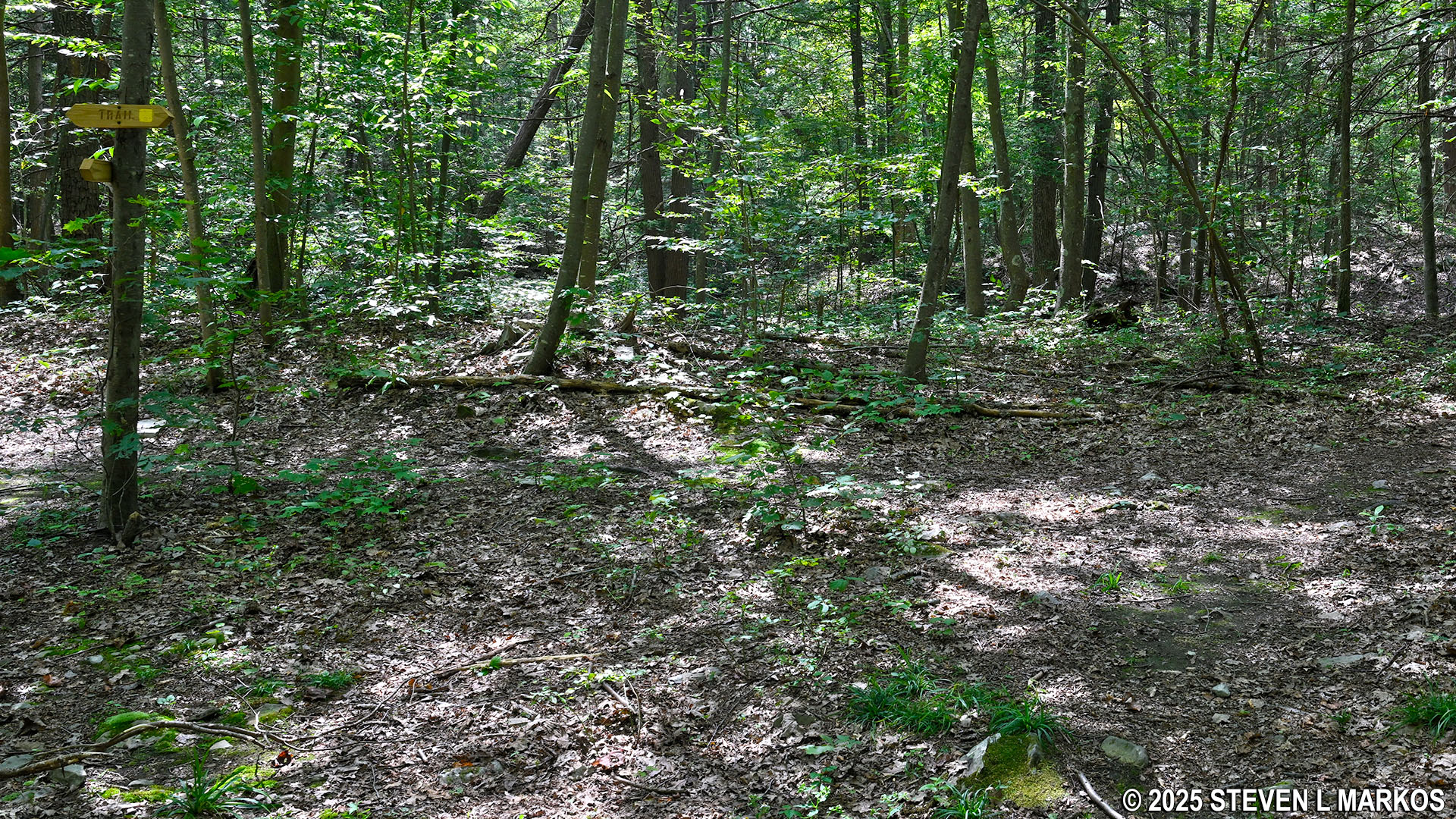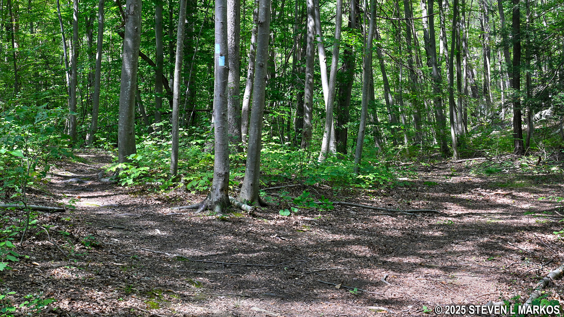 Near the halfway point is a fork that is not on the map. There is a double blue blaze on a tree that stairsteps to the left. Double blazes indicate a turn, and the direction of the stairstep indicates which way to turn, in this case left. I have no idea where a right leads to.