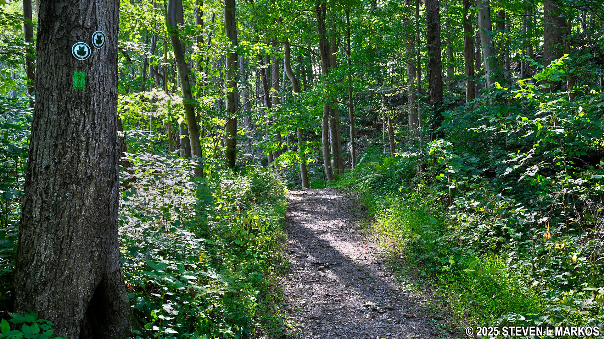 The blazes on this trail are green paint splotches for the Forest Trail and a leaf logo for the Hyde Park Trail. Blazes are markers that serve as Hansel and Gretel breadcrumbs for hikers to follow, though on the Forest Trail they aren’t all that necessary, for the trail is very easy to follow, and there is directional signage at all intersections.