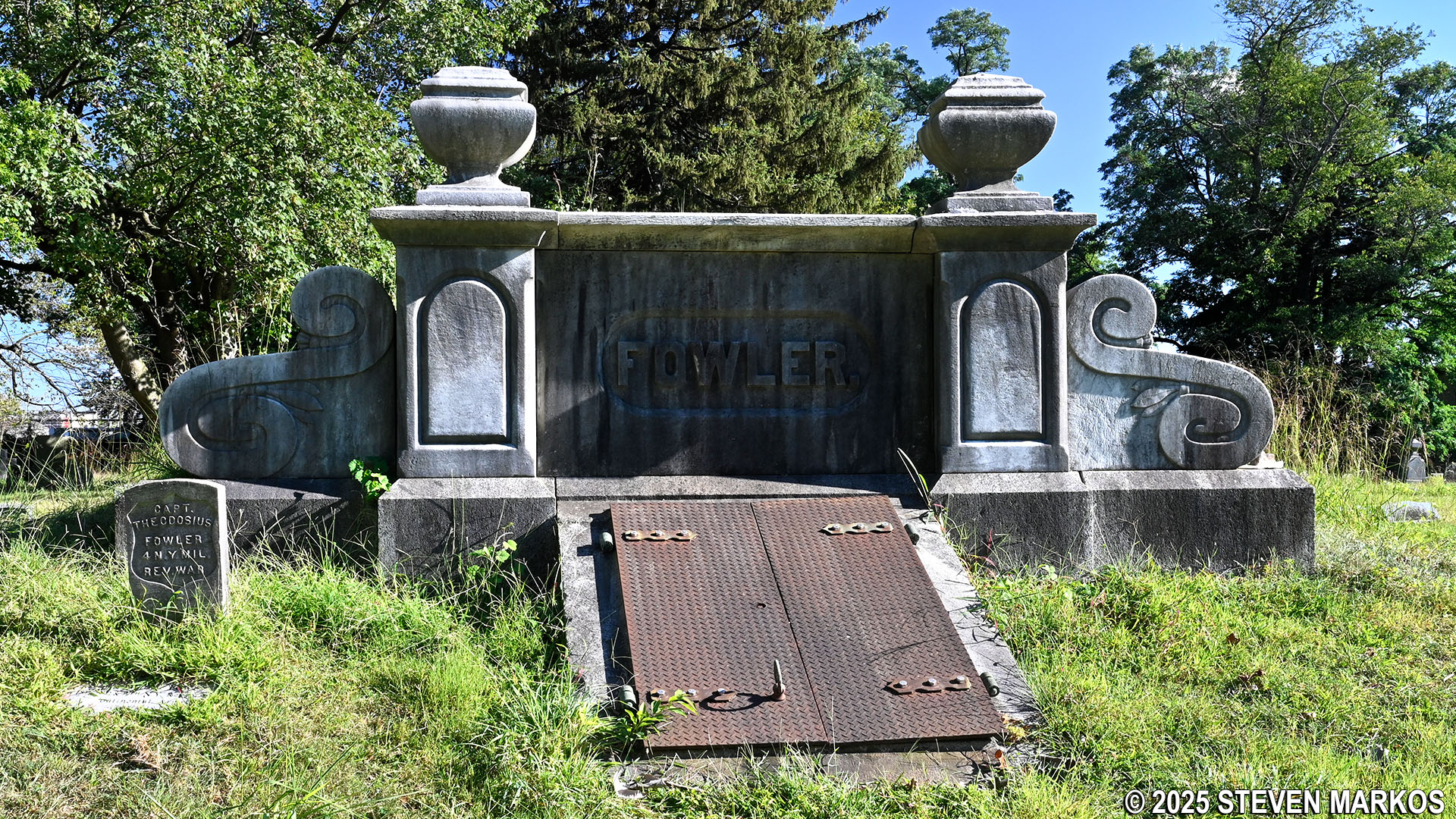 There are some burial vaults in the cemetery as well. The Fowler Family has one, and if you take a look from the side, you can see that the vault extends above ground and is covered with grass.