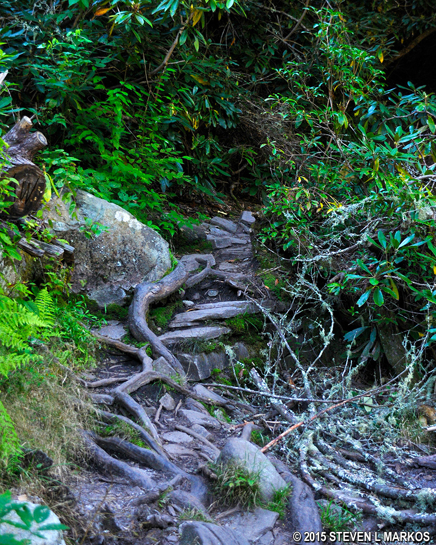 Once on the trail to the Gorge, the easy hiking is over. Not only is the trail steep, dropping a good distance to the bottom of the gorge in less than a half mile, but the terrain is as rough as you will find on the Blue Ridge Parkway, or on the East Coast for that matter. The ground is littered with python-sized roots and rocks ranging from head- to body-size. You are constantly taking one- to -two foot high steps up or down rocks, which is hell on the knees. On more than one occasion you must climb the rocks. And did I mention the stairs?