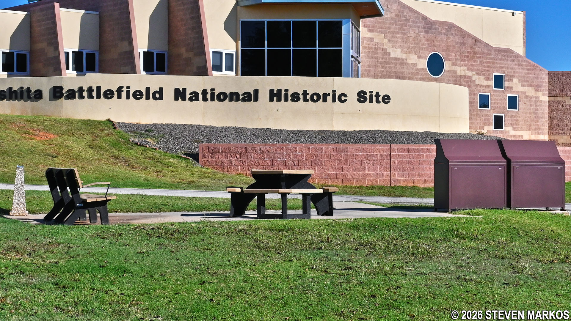 While not an official picnic area, there are four tables (no grills) near the Visitor Center at Washita Battlefield National Historic Site. The tables are taken on a first-come, first-served basis. All are situated on cement pads and are handicap accessible. Restrooms are available inside the Visitor Center.