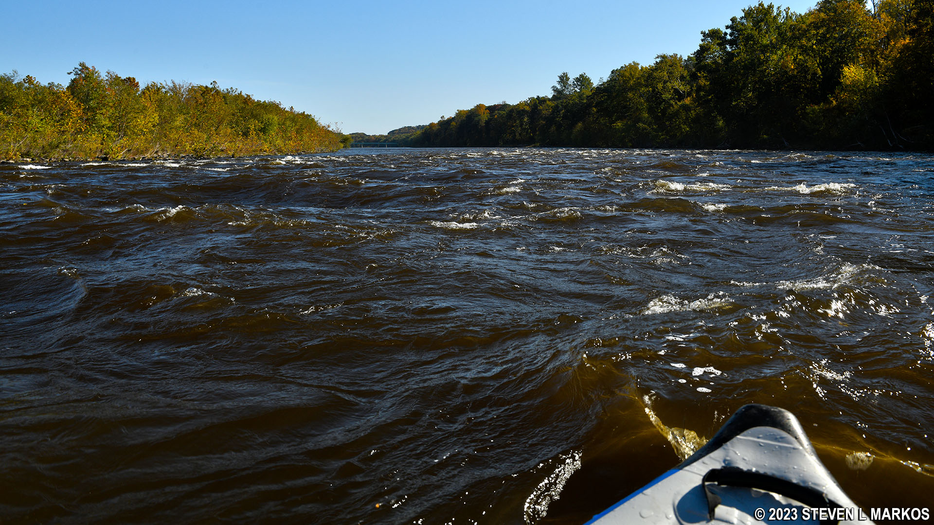 The most pertinent water level gauge to Kittatinny Point is the Water Gap gauge just 3.5 miles upriver near Depue Island and the Worthington State Forest Campground. On the day of my trip, the Water Gap gauge reported 7.15 feet of water and the Montague gauge 7 feet. This was at least a foot higher than when I made my trip down the Delaware River from Milford Beach to Kittatinny Point a few days earlier. As a result, the rapids were much larger than anything I had previously encountered, though they were still nothing more than Class I and II rapids. While I don’t recommend this section at 7-foot-plus water levels for a solo paddler who has never been in a canoe or kayak, anyone with basic paddling skills should not have any problems. Regardless of skill level, if you haven’t been wearing your life jacket up to this point, I suggest putting it on.