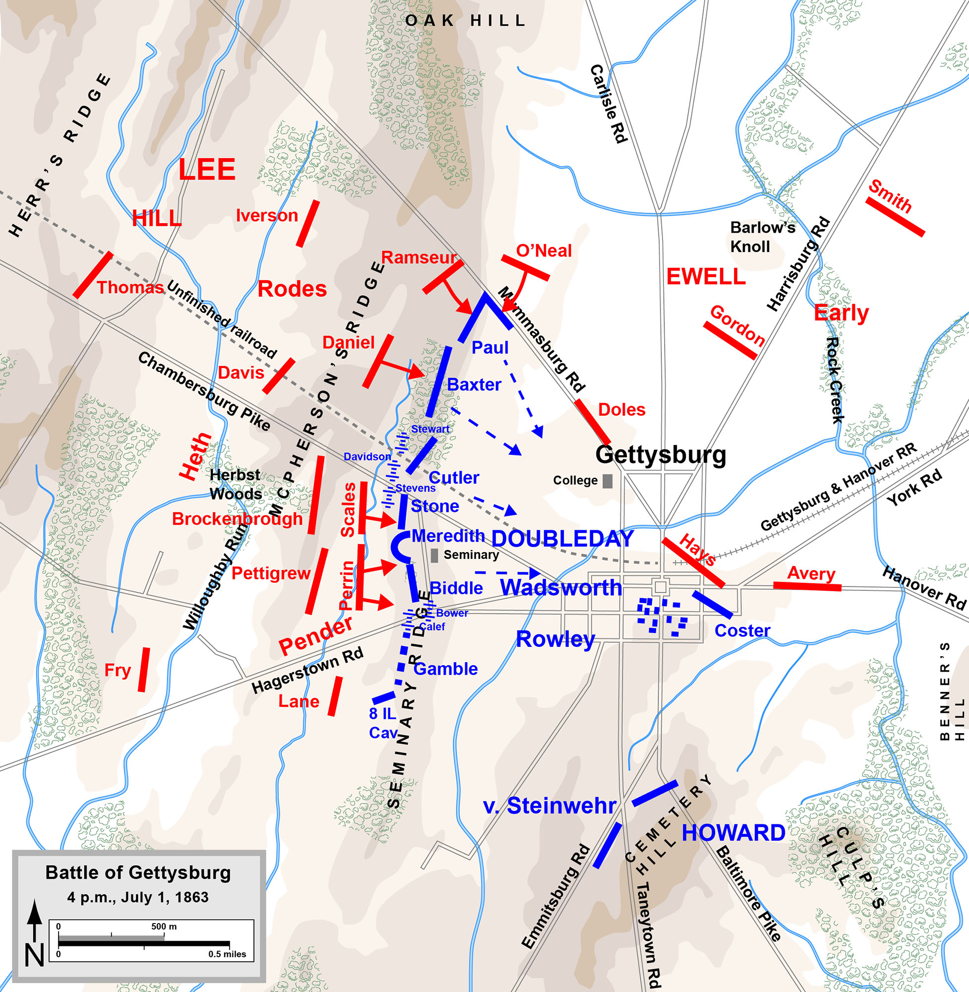 Howard’s three divisions arrived during the noon-time lull in the fighting. He positioned the First and Third Divisions north of Gettysburg, with the left flank just a few hundred yards from Baxter’s 2nd Brigade. By the time the fighting began again around 1 PM, the Union line extended east to near the Heidlersburg Road (now the Harrisburg Road). Howard held back the Second Division and placed it on the high ground south of the town at Cemetery Hill. Combined with I Corps to the west, the Union battle line formed a hook around the western, northwestern, and northern perimeter of Gettysburg.