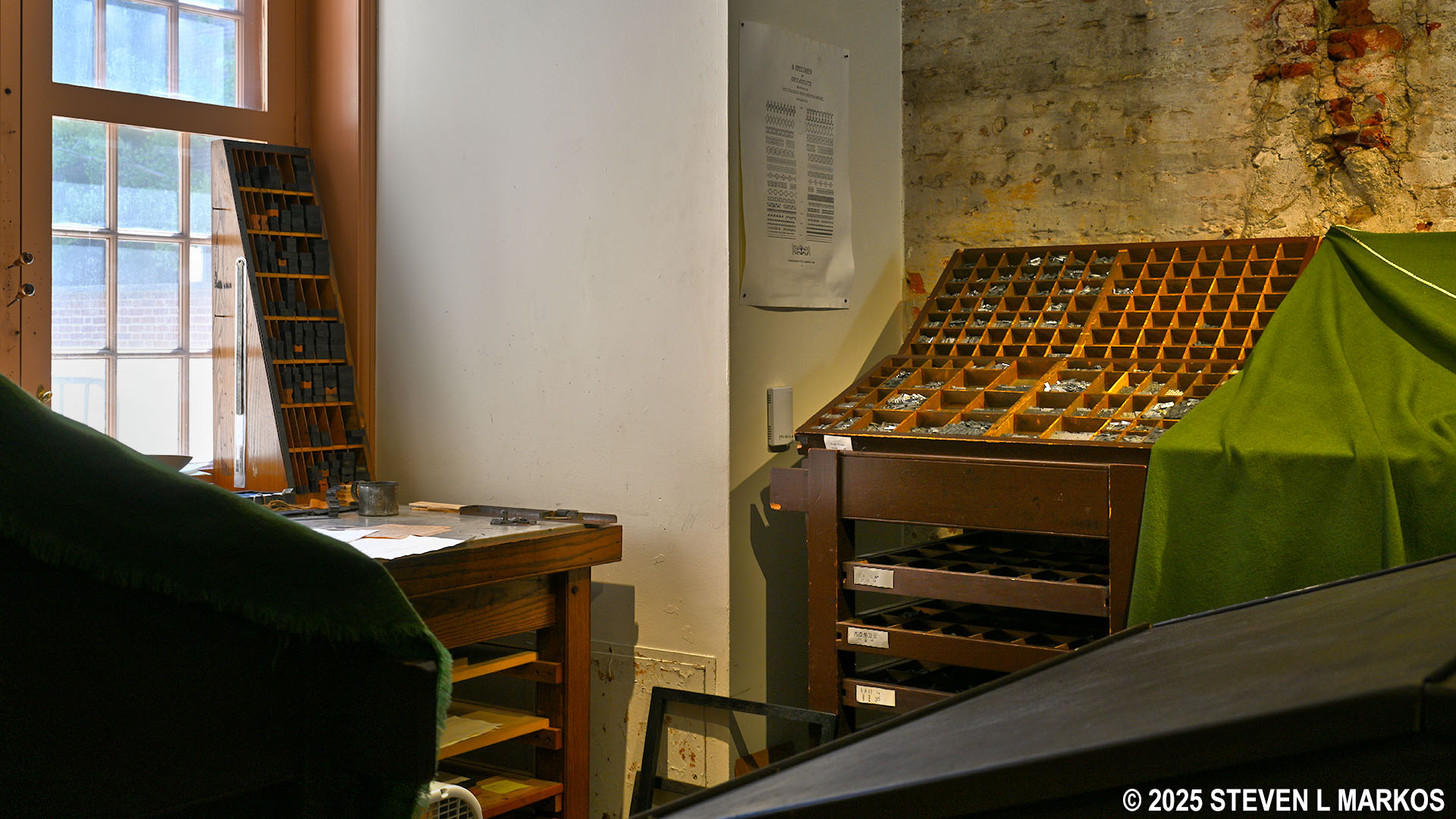 Typesetting equipment on display inside the Franklin Court Printing Office at Independence National Historical Park