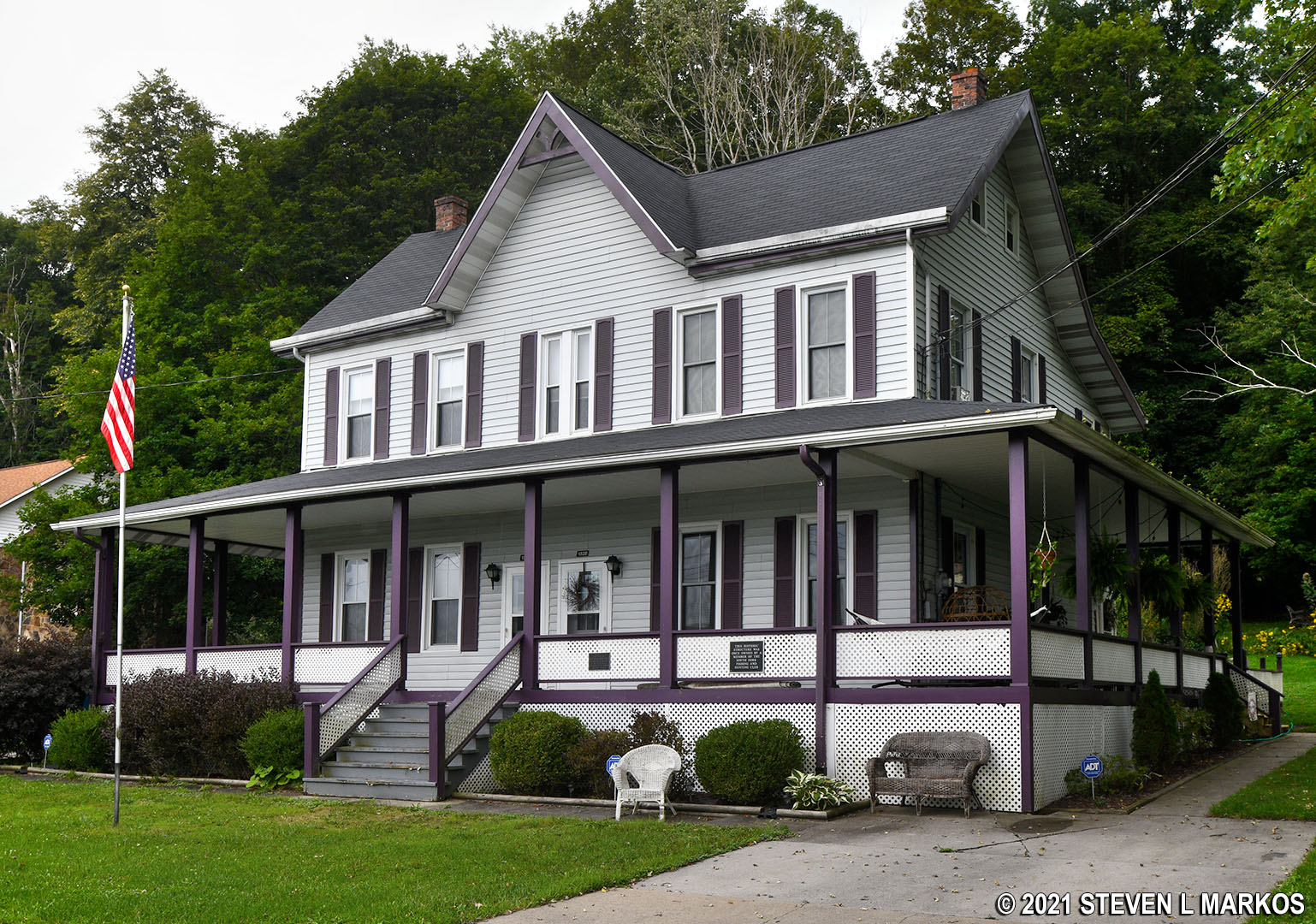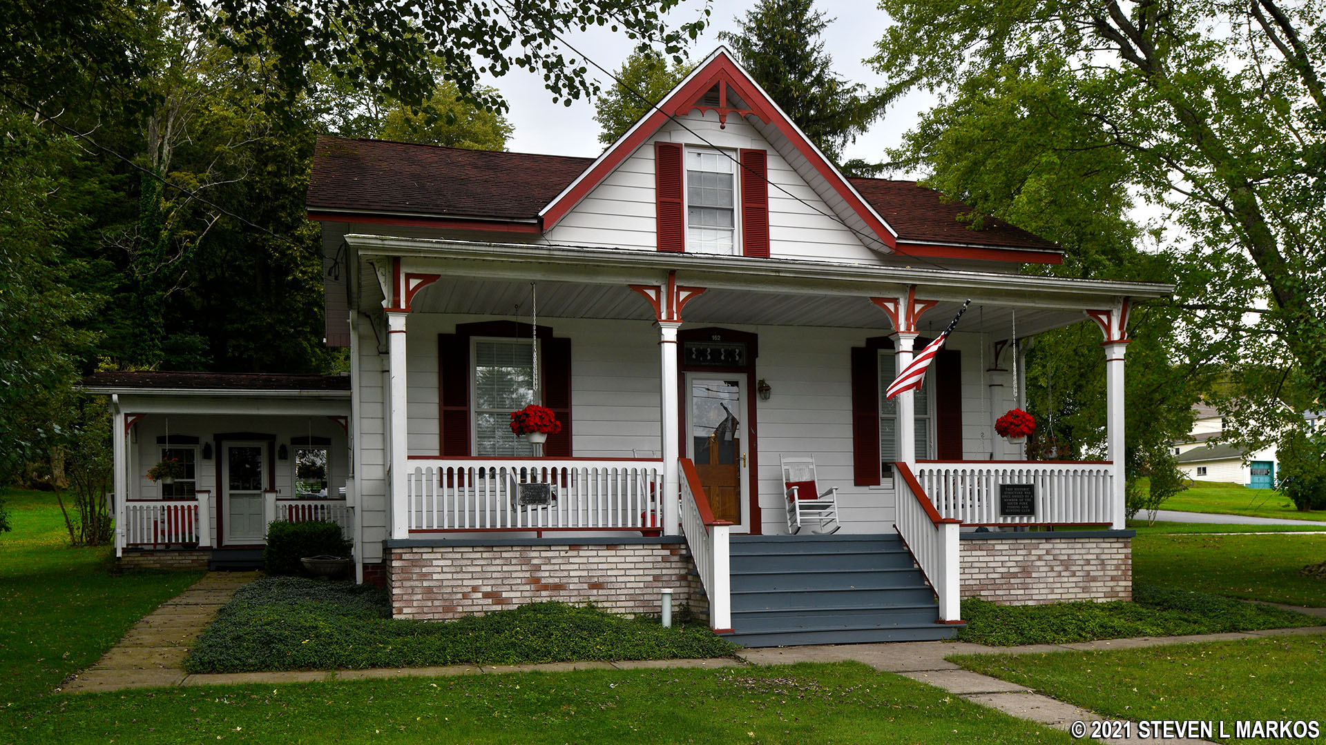 The second stop on a self-guided tour of Johnstown Flood National Memorial is the St. Michael Historic District, home of the South Fork Fishing and Hunting Club’s clubhouse and a few surviving cottages once owned by club members. To get here from Stop 1, the North Abutment of the South Fork Dam, continue down Lake Drive until it dead ends into Locust Street. Take a right on Locust, and when you come to the town of St. Michael, take a left on Main Street. This curves around to the right and passes the clubhouse and cottages. Most of the remaining cottages are now private residences, so you can’t go inside. The clubhouse is also closed to the public except to those on a Ranger Guided Van Tour or attendees of the annual Clubhouse Tour held on a select Saturday in May, typically around Memorial Day. However, visitors to the park can stop at any time to see the clubhouse from the outside and to sit on the front porch. There is a parking area on the right side of the building.