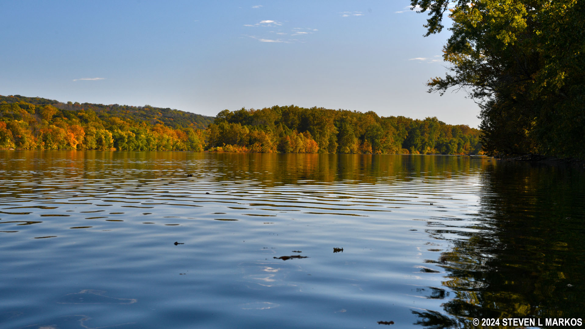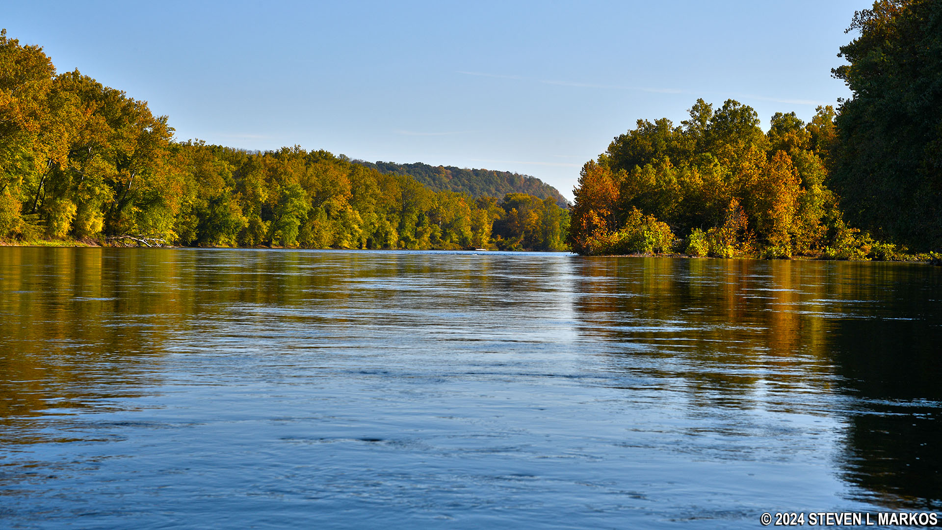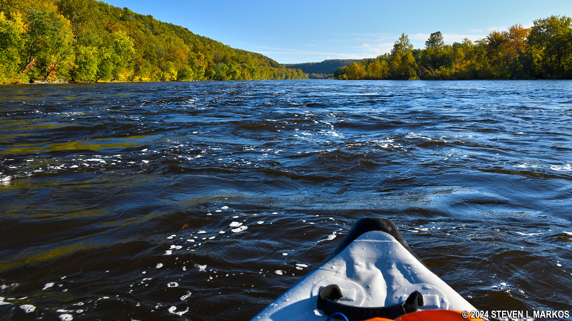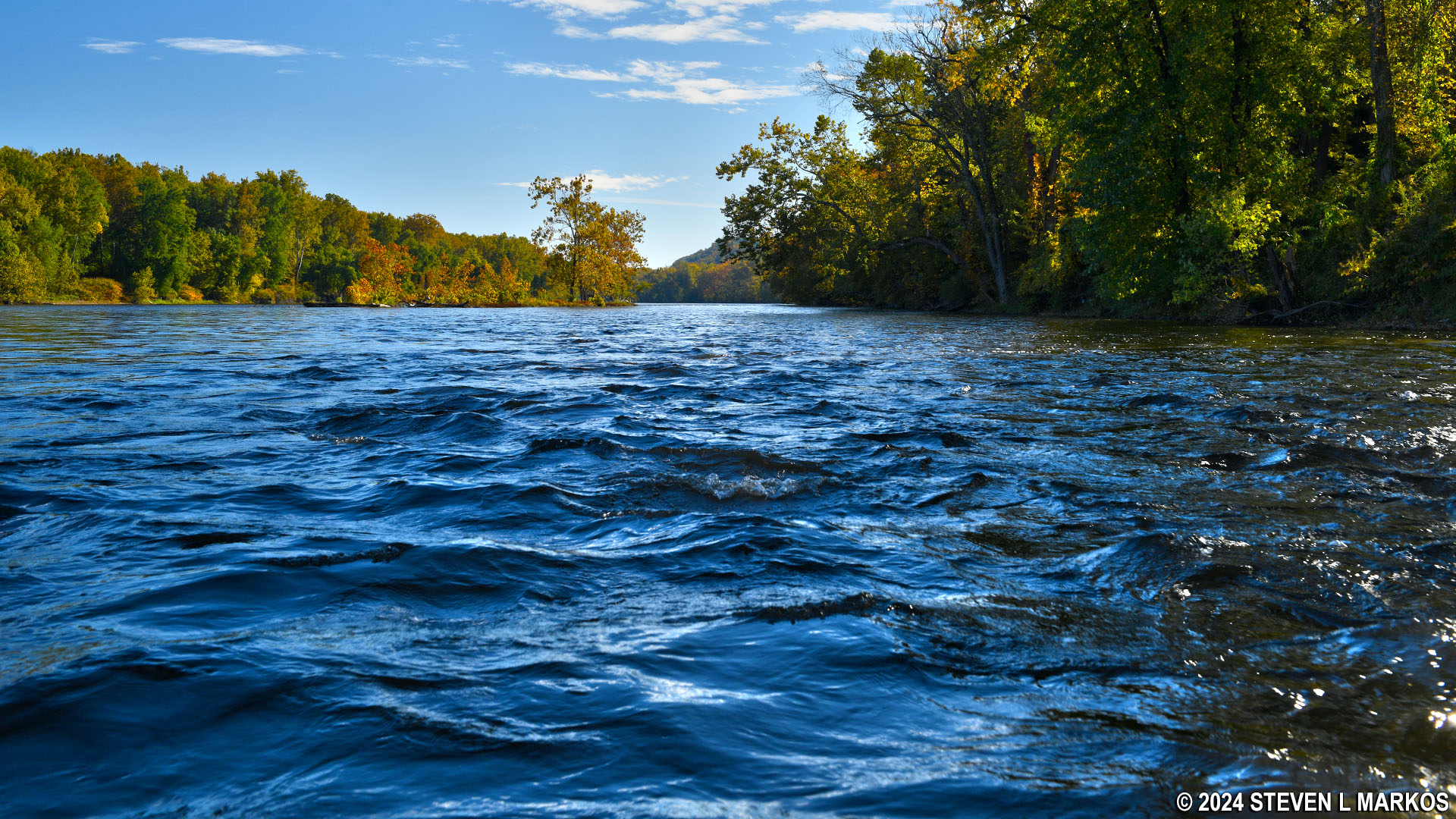 Before starting a trip down the Lower Delaware National Wild and Scenic River, always check the water levels so you have an idea of the river conditions. The most relevant United States Geological Survey (USGS) water level gauges for this trip are at Frenchtown, New Jersey, and at Stockton. On the day I did the trip in mid-October, the Frenchtown gauge reported 3.4 feet of water and the Stockton gauge 2.6 feet. The observations in this report are based on these water levels. If you do the trip when the levels are significantly lower, you may be dragging your boat to deeper water in some places and probably won’t experience the same degree of rapids as reported. If the water levels are significantly higher, you may experience more intense rapids, and more of them. Also be aware that regardless of water levels, extreme winds can cause turbulent conditions that require advanced skills on water otherwise suited for all paddlers.