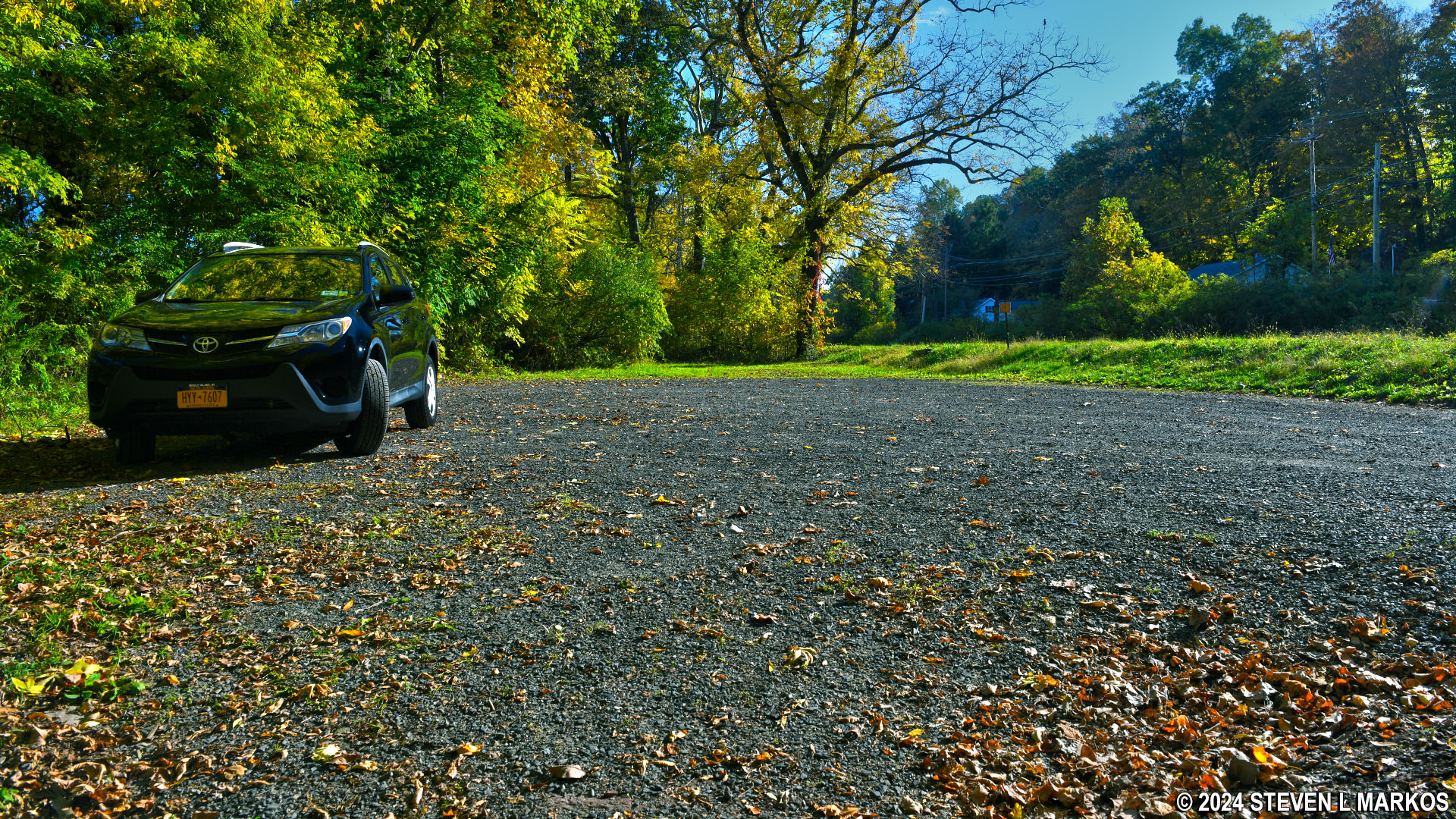 Small parking lot for the canoe launch at the midway point of Marshall Island on the Pennsylvania side of the Lower Delaware National Wild and Scenic River