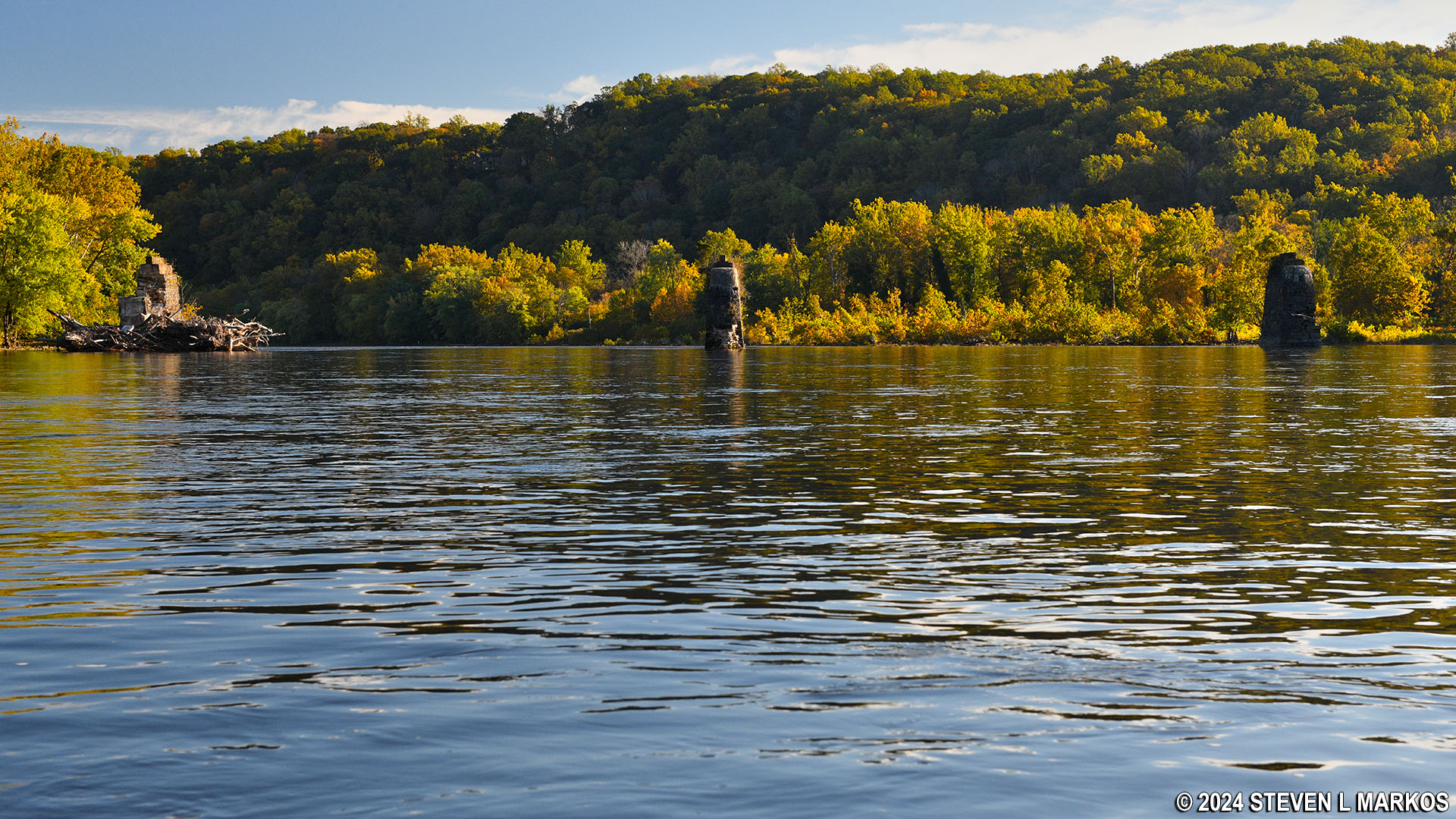 There is a gap of about a half mile from the downriver end of the large group of islands and another group of three more islands prior to the Byram Boat Ramp. Two of these are large enough to have a name—Walls and Prahls islands—and one is pretty small. As with the entrance channel around Marshall Island, there is a nice run of small rapids caused by the swifter current when the river channel splits. I was moving along at 7 MPH without even paddling. However, this time I hit a few underlying rocks, all coming at a point where there were standing whitecaps of water (whitecaps that seem to stay in one place), so avoid these if possible. The whitecaps are caused by either exposed rocks or rocks just inches beneath the surface. At higher water levels, with the rocks far below, the water may well be calm though still swift moving.