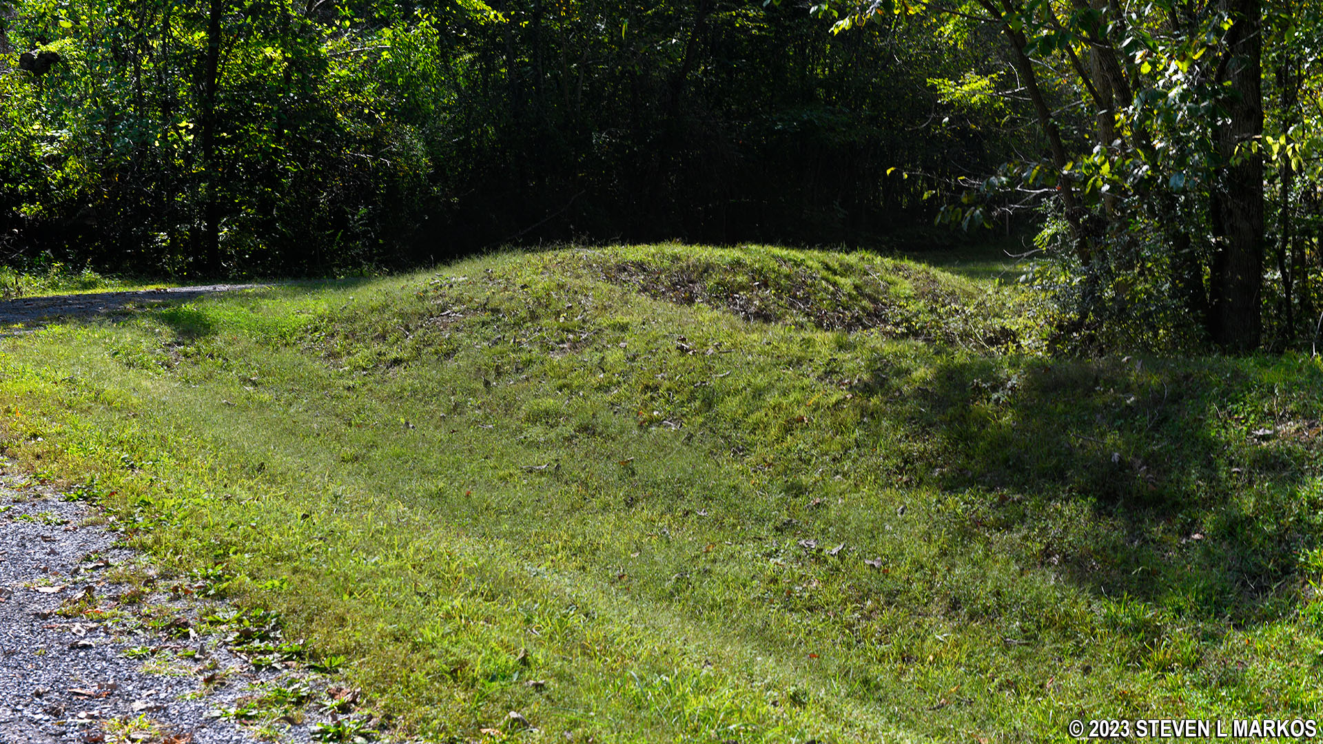 In truth, a visit to Fort Heiman is only for the most ardent of Civil War history buffs, but if you want to see it, here’s what to do. Start walking down the road from the pavilion to the first of two forks. One of the roads is nothing but a driveway to a private house on the hill, so head in the other direction. The road then splits again shortly thereafter. This is actually the start of a loop that goes around the area where Fort Heiman once stood. It doesn’t matter which way you go, but I stayed to the left and went up the hill.