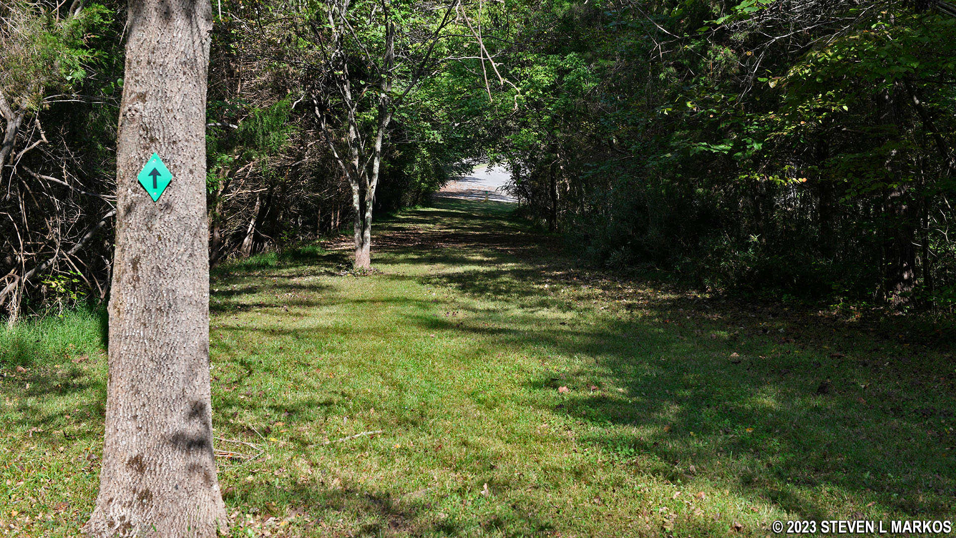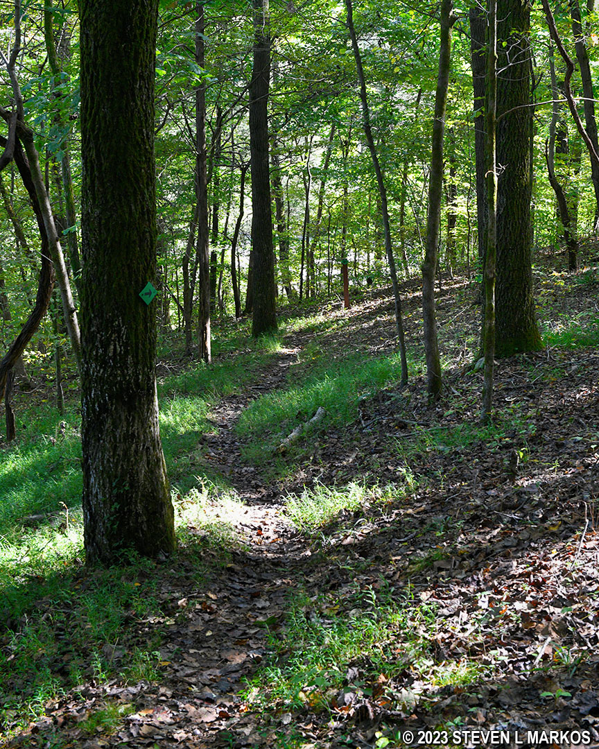 The National Cemetery Trail is blazed with green tags attached to trees that you follow like Hansel and Gretel breadcrumbs. There is often one blaze within eyesight of the other despite the fact that it is obvious which way to go.