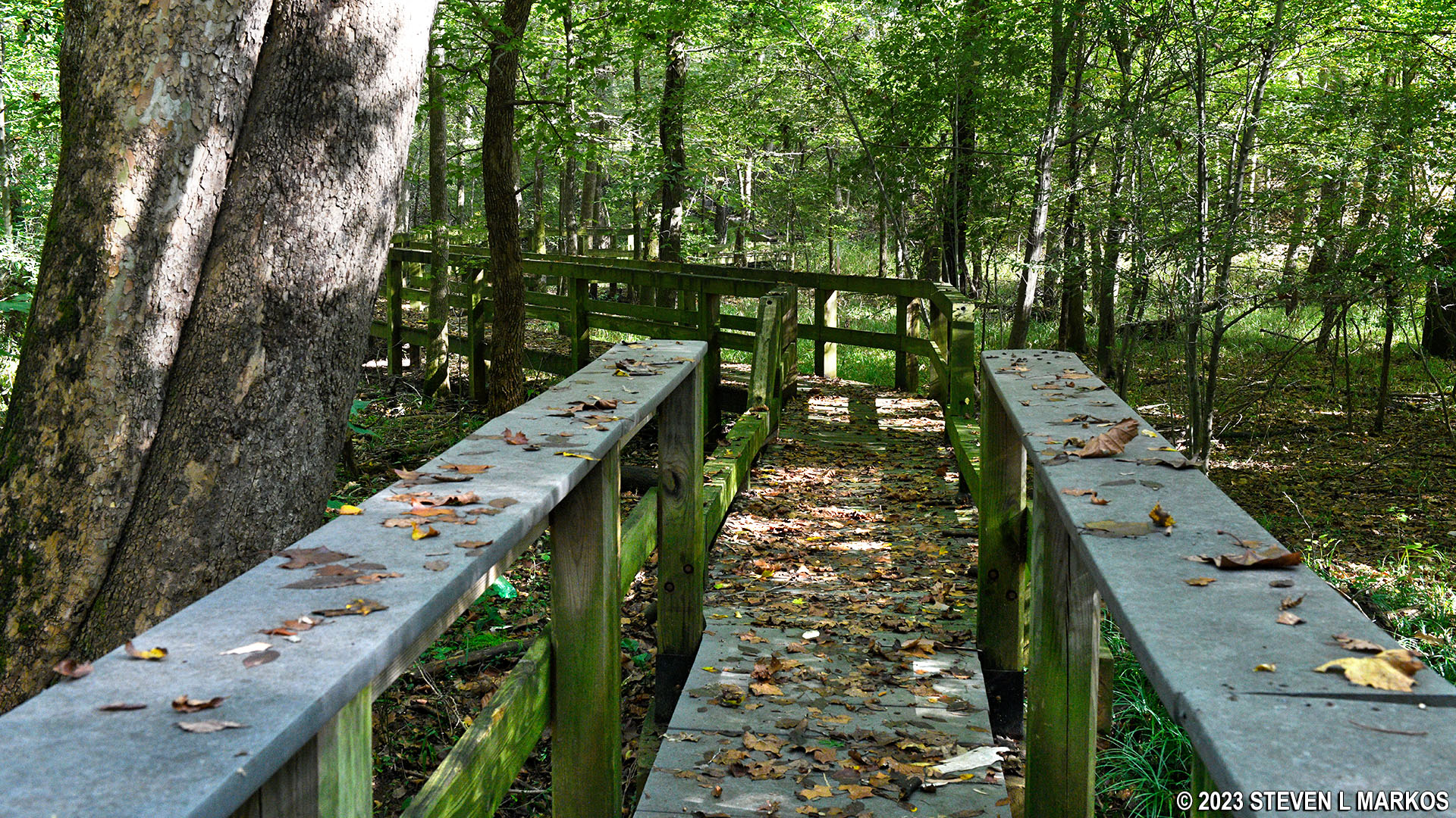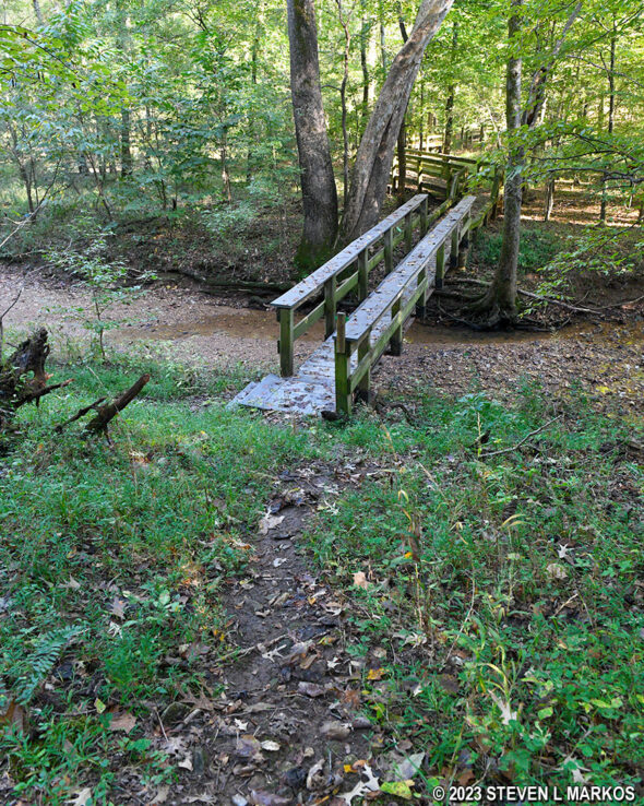 At the bottom of the hill is a stream, Indian Creek, that is spanned by a footbridge, and once across it, the trail becomes a boardwalk. However, the trail continues straight ahead, passing right by the bridge. There’s even a green blaze on a tree. Look across the creek on the boardwalk and you’ll also see a green blaze, so things are a little confusing. All that is happening is that it’s a little steep down to the bridge, so the trail continues straight then loops back like a wheelchair access ramp. You can either follow the trail or just shuffle down the hill to the bridge. Straight ahead is actually a little overgrown, which means most people take the shortcut.