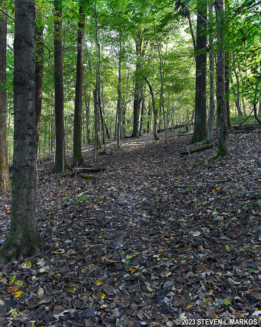 The next .4 mile of the hike is on fairly level ground. In fact, you’ll soon be walking along what appears to be a narrow lake, though it is just a really, really wide version of Indian Creek. The Cumberland River is dammed in this area, which caused it to widen and form what is now called Lake Barkley. With the river water now moving at lake speed (not very fast), the streams that flow into it get backed up as well, thus the wide version of Indian Creek that you now see.