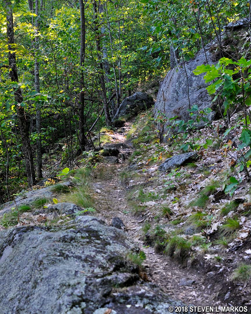 The first stop on the hike is the South Peak of Mount Tom, which is reached via the Precipice Trail, one of the more difficult in the park. To get to the trailhead, continue up the mildly sloping Mountain Road and take the first left past the Forest Center onto another carriage road (there is no sign identifying it). This road intersects with yet another carriage road in just 500 feet; take a right. Straight ahead is what is identified as a horse shed on the map.