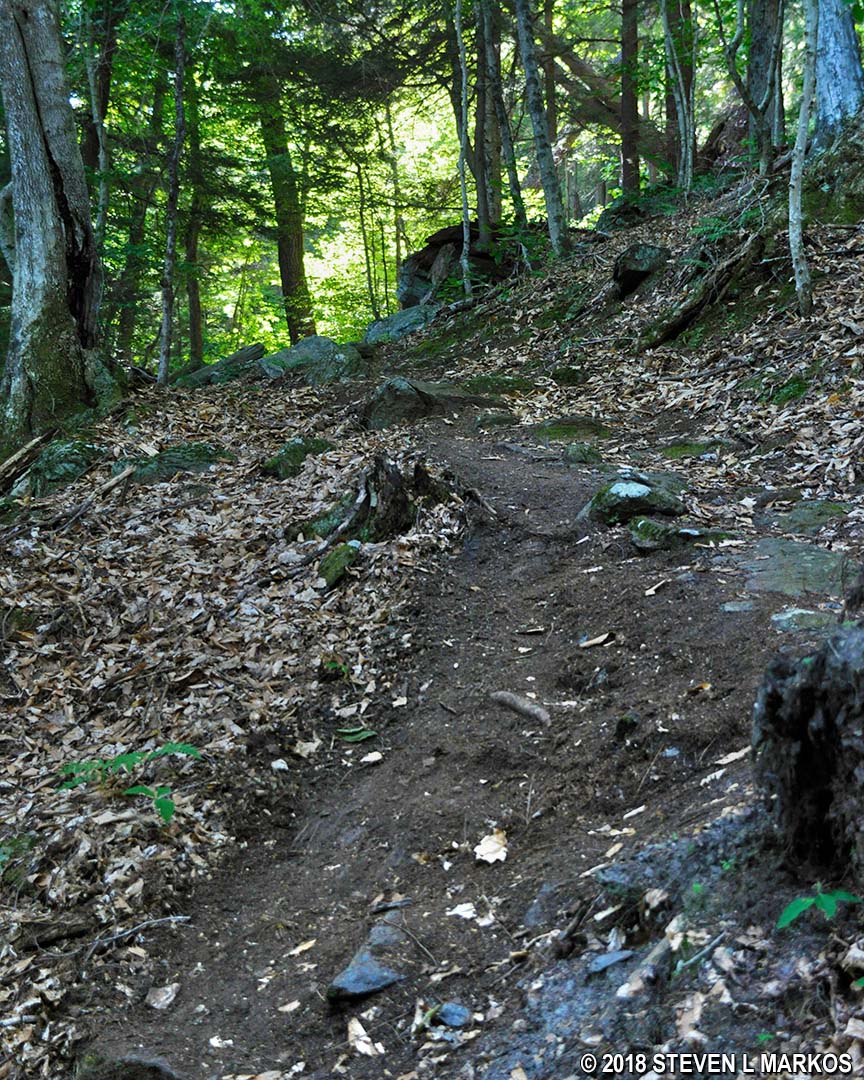 Steep grade and rough trail surface of the Precipice Trail in Billings Park, Woodstock, Vermont