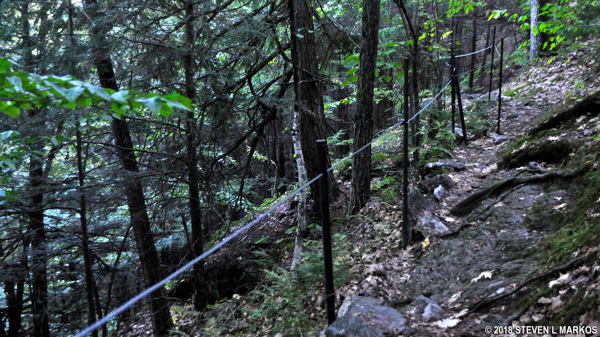 Wire guardrail along the steeper sections of the Precipice Trail in Billings Park, Woodstock, Vermont