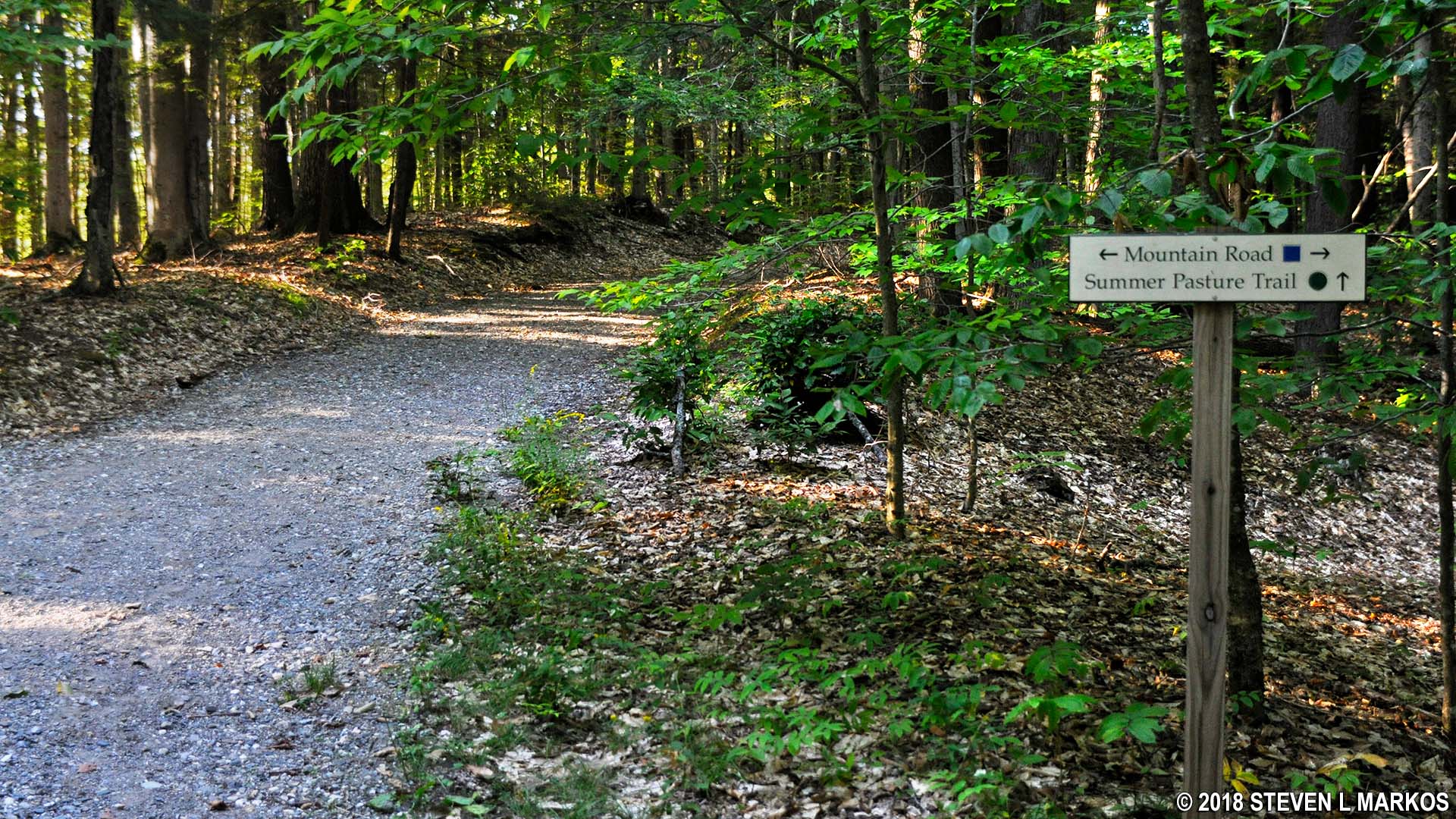 Mount Tom Road ends at the intersection with Mountain Road, though the road continues on the other side under the name—per the trail map—Summer Pasture Road. The identification sign, however, calls it Summer Pasture Trail. Part of it is similar to the ski trails, and other parts are gravel like a carriage road. It is definitely not what is considered a hiking trail.