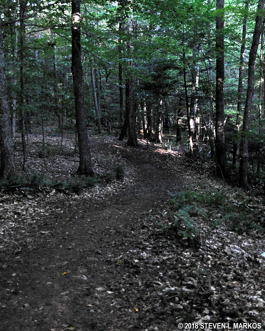 The first intersection after passing the pond is that with the North Ridge Loop carriage road. This is a triangular intersection, so there is an initial turn to the left and then another one just fifty yards farther down the road. I point this out because the intersection with the Spring Lot Trail is not marked—at least not at the intersection—and when I say to take the first left past North Ridge Loop, I don’t mean the second left at the triangle. The turnoff for the Spring Lot Trail is another .2 mile away. There is a sign, but it is located a short ways down trail, not at the intersection, which makes no sense.