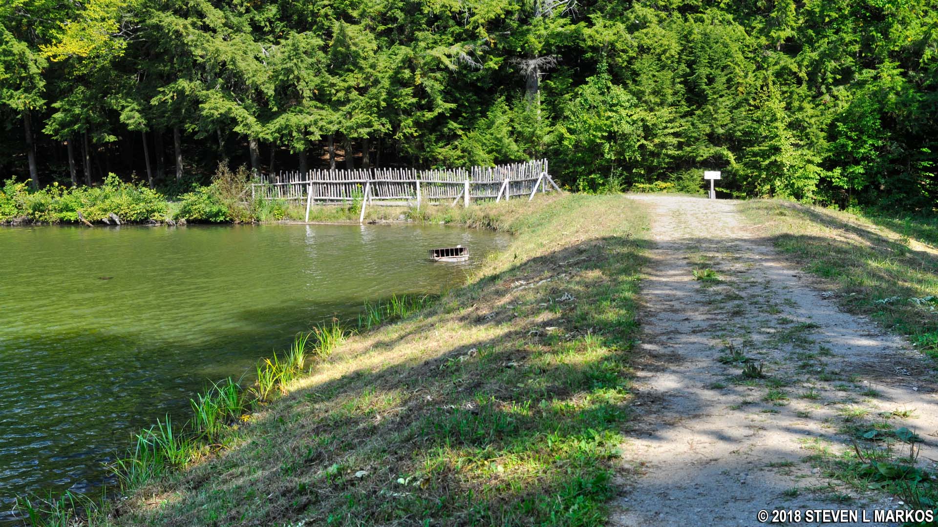 Earthen dam that creates The Pogue, a small pond in Marsh-Billings-Rockefeller National Historical Park