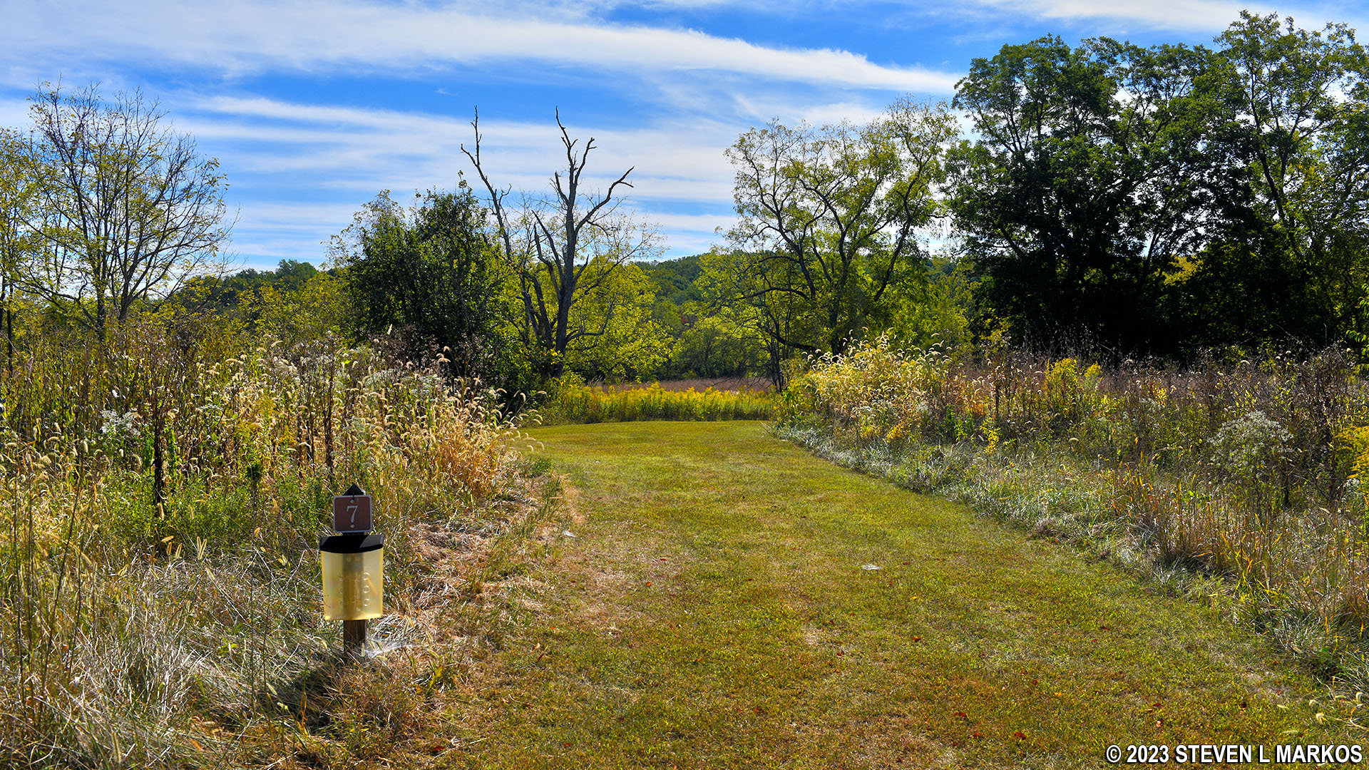 The Ferguson Wildlife Trail is a typical nature trail with numbered posts along the route that correspond to text on a printed brochure that describes the natural features of the area. This brochure should be in a box attached to the sign at the start of the trail. Hopefully the box is stocked when you visit, otherwise you will just be hiking a short loop around a meadow without learning anything.