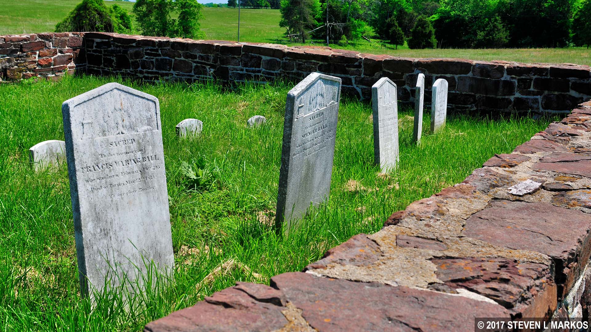 From the house site you can continue along a mowed path for a quarter mile to the Ball Family Cemetery. There are a half-dozen tombstones, but no information about the Balls is provided.