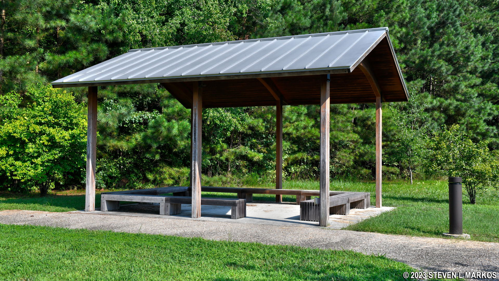 Three picnic tables are located at Petersburg National Battlefield’s Five Forks Battlefield Visitor Contact Station. There is also a covered pavilion, but it only has benches. However, if you find yourself here on a hot day and want a bite to eat, the three tables are not only out in the sunshine, they are also situated on a cement pad, which makes a hot day ever hotter. I’d be eating in the shade under the pavilion.