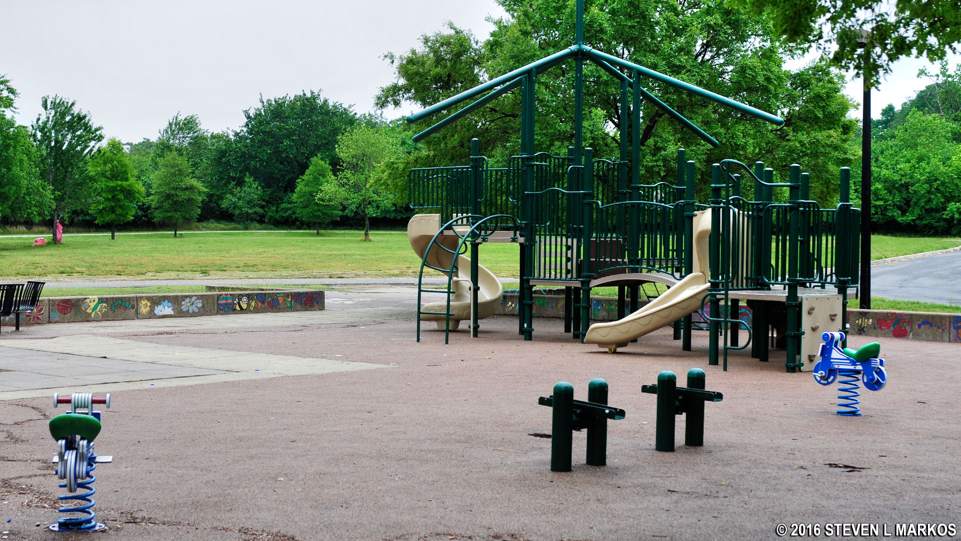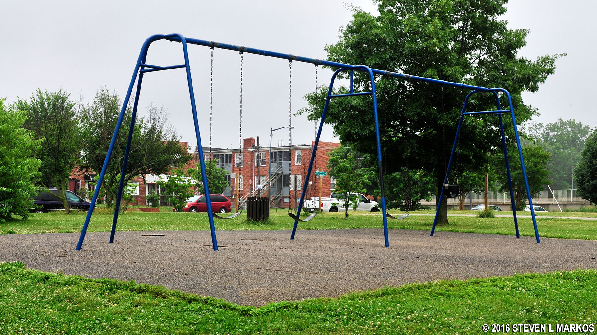 One other playground is at River Terrace Park, which is located along Anacostia Avenue between Benning Road and the East Capitol Street Bridge. At the intersection with Benning Road are tennis and basketball courts, but if you drive farther down the road you will come to the playground. This is more like a neighborhood park than the main section of Anacostia Park, with residences and businesses on one side of the road and the park on the other. Parking is on the street, so you are competing for spaces along with everyone else coming to the area.